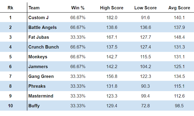 With Rice's return in the second half - the Monkeys finished with the second best record which allowed them and and Gang Green to watch from their homnes as the first playoff bracket unfolded. #4 Jail Yard Boyz demolished #5 A Squad Called Blitz (Thien) 151-120 in Round 1, while #6 custom J (Joshua) upset #3 Philadelphia Phreaks (Ping) 130-119 in the biggest surprise of the postseason.